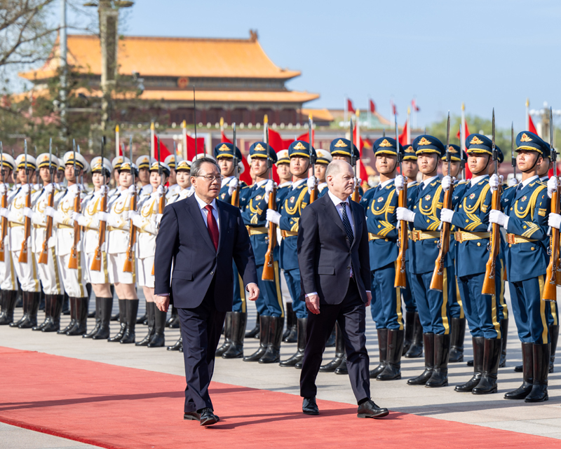 4月16日下午,国务院总理李强在北京人民大会堂同来华进行正式访问的德国总理朔尔茨举行会谈。会谈前,李强在人民大会堂东门外广场为朔尔茨举行欢迎仪式