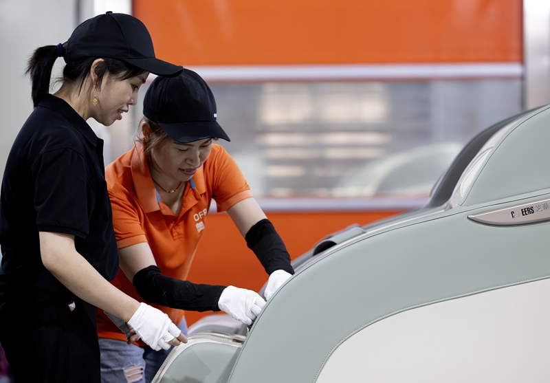4月16日,在奥弗锐(福建)电子科技有限公司按摩椅生产线上,两名工人在检验生产出口德国和韩国的智能按摩椅产品
