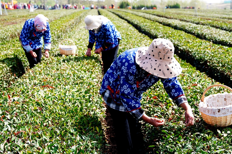 4月16日,在日照市岚山区巨峰镇,茶农在采摘鲜茶