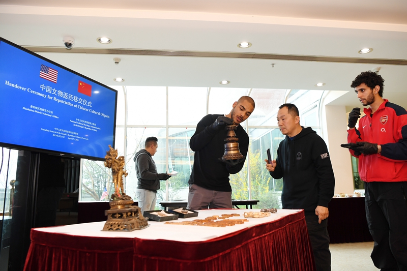 4月17日,在美国纽约中国驻纽约总领馆,工作人员点交中国流失文物艺术品