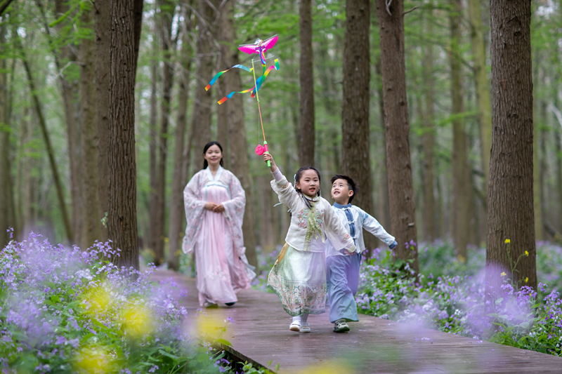 4月17日,游人在江苏兴化里下河国家湿地公园游玩